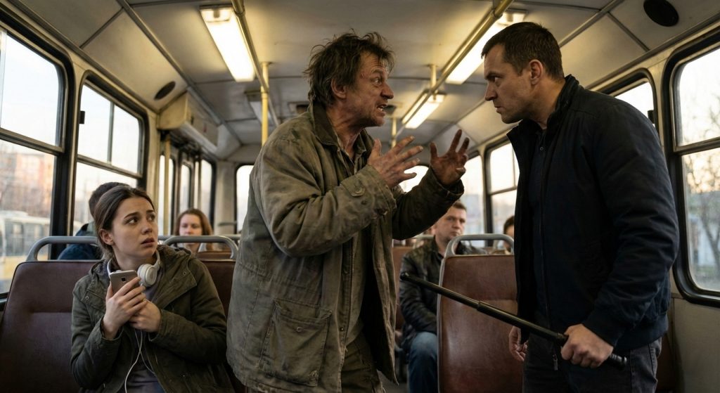 Al terminar el día, recibe una llamada de su hija desde el autobús que la lleva a casa. Ella le cuenta, muy asustada, que el autobús está detenido y que dentro hay una persona alterada, poniendo en peligro y aterrando a los pasajeros. Tras preguntarle por la ubicación y comprobar que el autobús está cerca de casa, decide ir a buscarla en coche. Para ello, se arma con una defensa extensible.